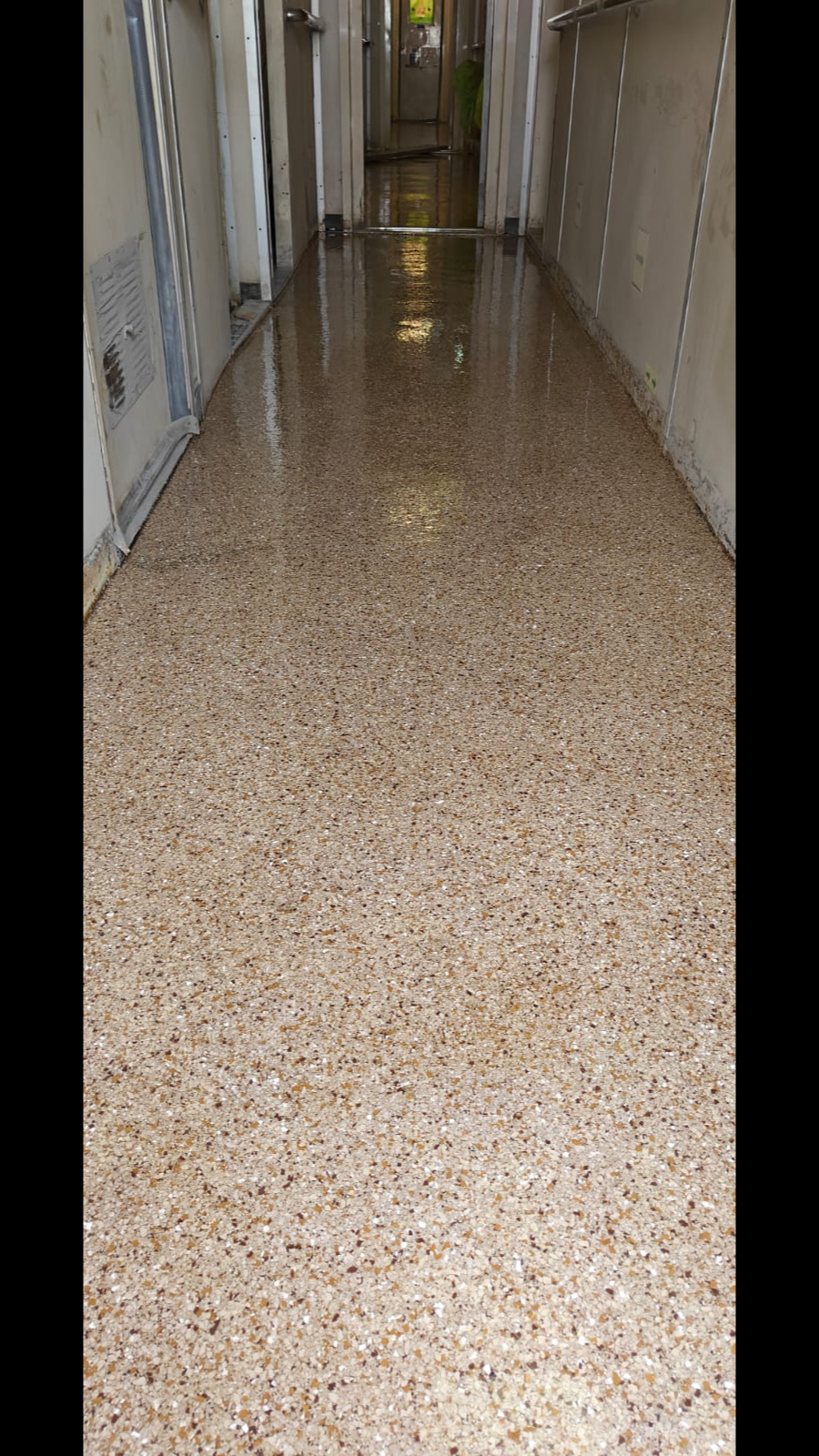 Standard coatings often fail on oil-soaked surfaces due to delamination, the process begins with advanced surface preparation, such as mechanical scarifying (rather than burning) to remove contaminated layers, followed by a specialized oil sealer to prevent future seepage. Once the foundation is stable, an industrial-strength epoxy base is applied, and decorative vinyl flakes are 'broadcast' into the wet resin. These flakes provide critical slip resistance by creating a textured surface that maintains traction even when wet or oily, which is vital for preventing accidents in offshore conditions. The system is completed with a clear, high-performance clear topcoat, resulting in a seamless, finish that protects against corrosion and withstands the heavy mechanical loads of drilling operations Epoxy Flake flooring done on oil rig Epoxy Flake Flooring completed at oil rig Anti skid Oil rig Flooring