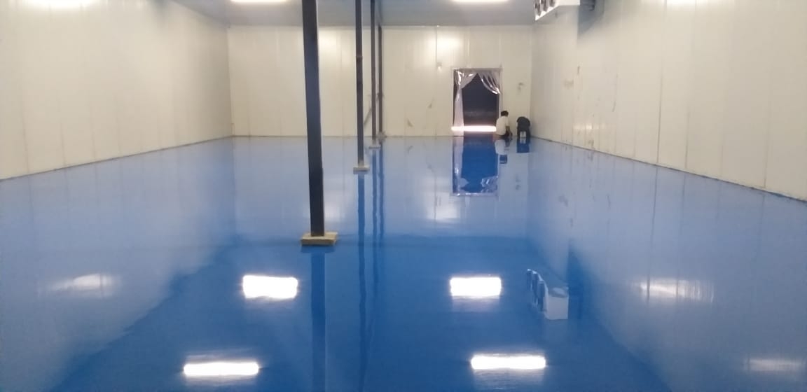 Self leveling Epoxy Flooring 1mm done on the epoxy base coat. RAL shade 5015 epoxy top coat applied Warehouse epoxy flooring.